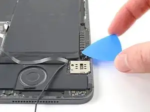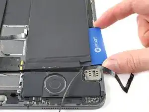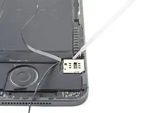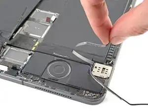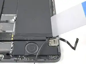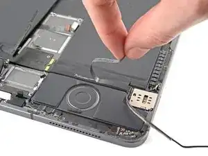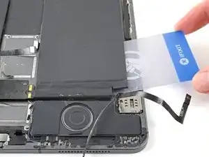 Отделите кабель считывателя SIM-карты к правому краю iPad, чтобы отделить его от платы батареи.