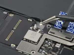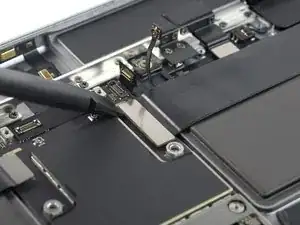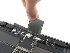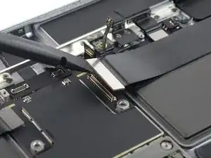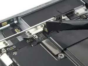 Повторно приложите подогретый iOpener к кабелю логической платы на 2 минуты, чтобы размягчить клей под ним.