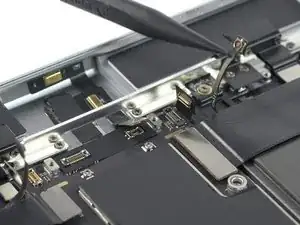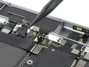 Воспользуйтесь пинцетом, чтобы отвести в сторону ленту разъёма Smart Connector и получить свободный доступ к кронштейну разъёма.
