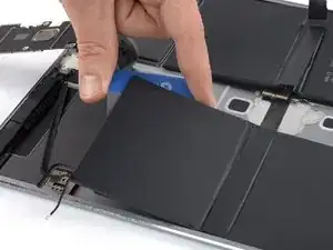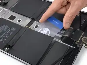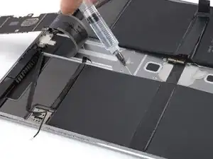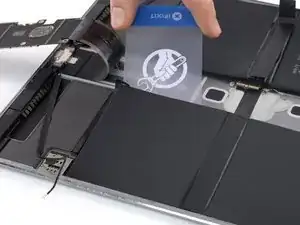Аккумулятор в данном iPad закреплён с помощью больших клеевых накладок. Используйте достаточное количество изопропилового спирта высокой концентрации или средства iFixit для удаления клея, чтобы снять аккумулятор и очистить остатки клея.