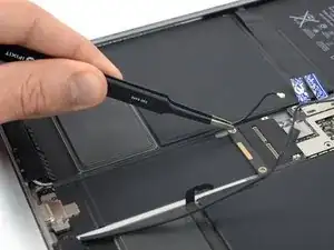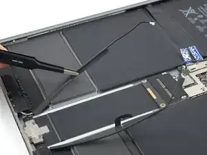 Повторите предыдущий шаг — пальцами или пинцетом приподнимите и отклейте левый антенный кабель от рамы iPad.
