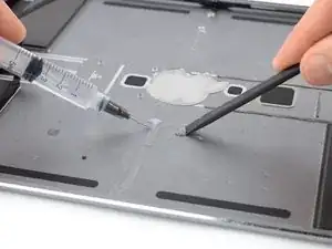 Наклоните iPad и нанесите несколько капель изопропилового спирта высокой концентрации (>90%) на внутреннюю сторону и нижний край верхней правой батарейки.