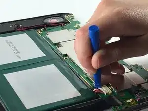 Используйте пластиковый инструмент для вскрытия, чтобы вытолкнуть провода, соединяющие аккумулятор с материнской платой, и отложите аккумулятор в сторону.