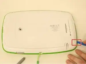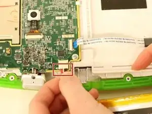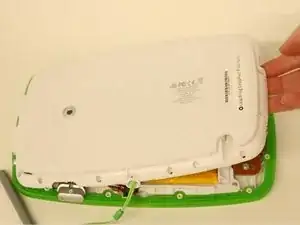 Используя пластиковый инструмент для вскрытия, подденьте пластиковую рамку, вставив инструмент в зазор между зелёным бампером и белым пластиком по краю планшета.