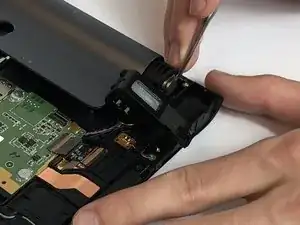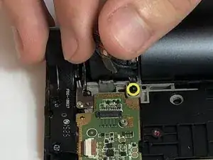 Найдите меньшую металлическую скобу, направляющую провода, выходящие из конца петли. Удалите одиночный чёрный винт 2 мм с помощью отвёртки PH00. Снимите скобу пальцами.