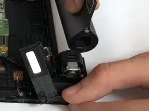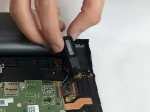 Положите планшет экраном вниз и петлёй от себя, найдите чёрный пластиковый элемент в верхнем правом углу.