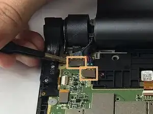 Снятие пластины откроет два серебристых разъёма на концах проводов, идущих из конца петли. С помощью пинцета осторожно снимите эти два серебристых разъёма.