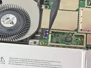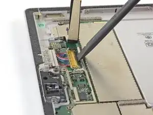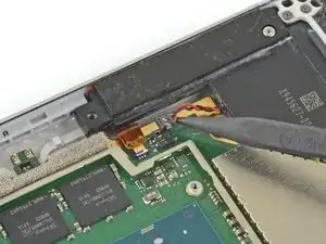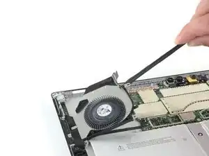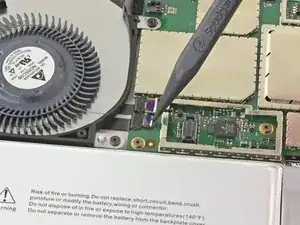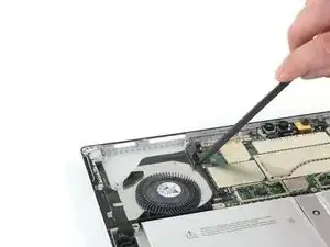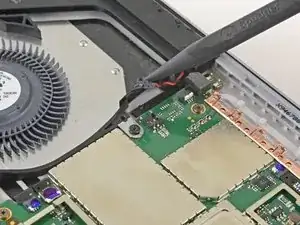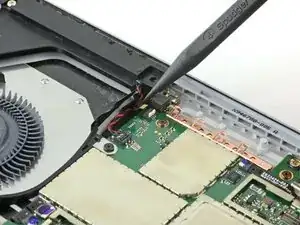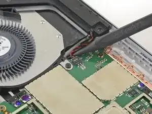 Используйте острый конец лопатки, чтобы аккуратно выдвинуть кабели вентилятора и разъёма для наушников из их ZIF-разъёмов.