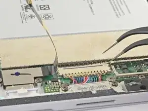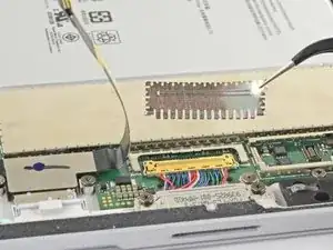 Используйте пинцеты, чтобы снять два экранирующих экрана, закрывающих разъёмы кабелей дисплея.
