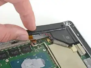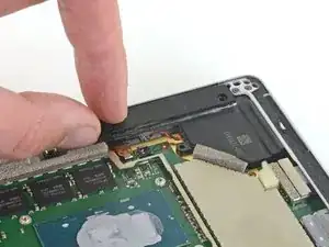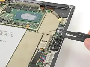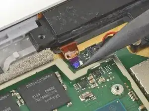 Вставьте один конец острой пинцета в зазор по краю экранирующей пластины ЭМП, закрывающей кабель и разъём кардридера microSD.