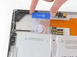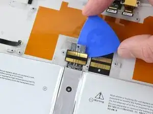 Начиная с края, противоположного аккумулятору, введите под разъём аккумулятора открывалку, чтобы отделить клей под ним.