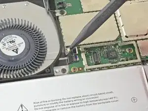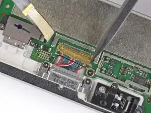 Вставьте один конец пинцета в зазор по краю экранирующей пластины, закрывающей разъём кабеля зарядного узла.