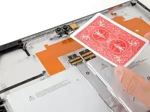 После установки новой батареи положите игральную карту или аналогичный предмет поверх разъёма батареи и оставьте его на месте, пока не установите материнскую плату.