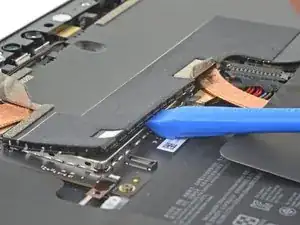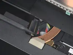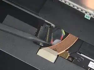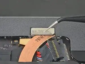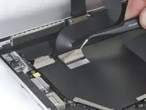 С помощью пинцета отогните серебряную ленту, закрывающую левый разъём дисплейного кабеля.