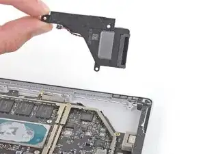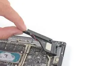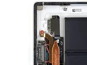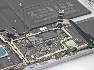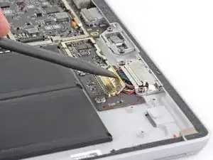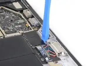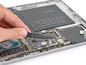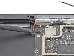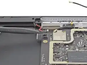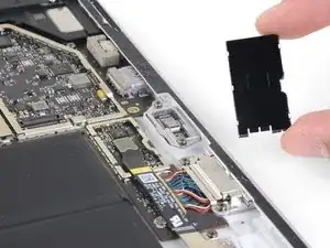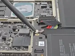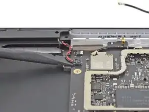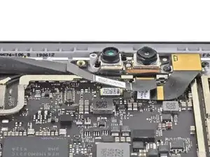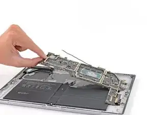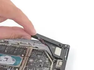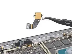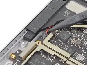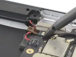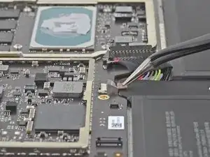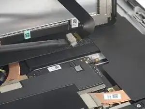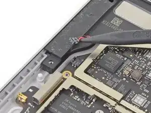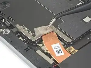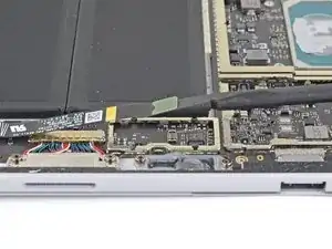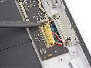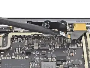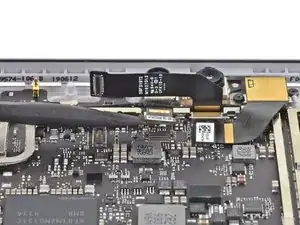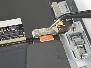 С помощью пинцета отогните серебряную ленту, фиксирующую правый дисплейный кабель к материнской плате.