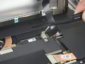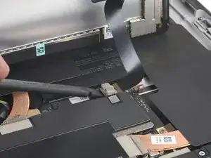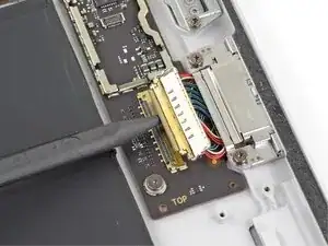 Используйте плоский конец лопатки, чтобы поднять правый дисплейный кабель строго вверх и отсоединить его от материнской платы.