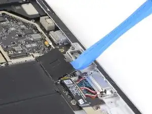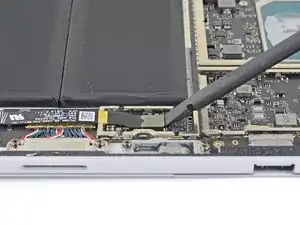 Используйте плоский конец лопатки, чтобы приподнять и отсоединить ленточный кабель считывателя microSD.