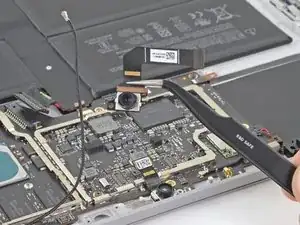 Используйте плоский конец лопатки, чтобы приподнять и отсоединить все три разъёма камер от материнской платы.