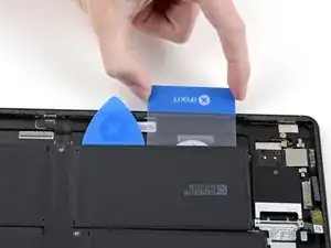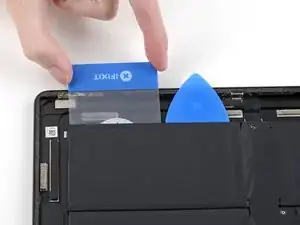 Сдвиньте инструмент для вскрытия в сторону аккумулятора, чтобы прорезать клей под правой стороной разъёма аккумулятора и полностью отделить его от корпуса.
