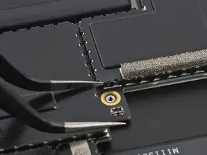 Используйте отвёртку Torx T3, чтобы выкрутить винт 2,4 мм, фиксирующий SSD.