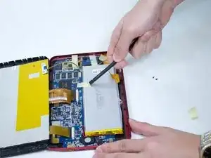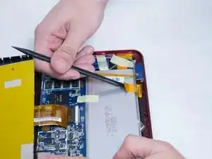 Используйте металлическую лопатку, чтобы удалить три кусочка прозрачной ленты, приклеенные к аккумулятору и синей плате.