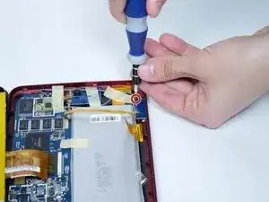 Используйте отвертку, чтобы удалить два винта с головкой Phillips #00 длиной 4 мм с синей платы, расположенной в нижнем правом углу аккумулятора.