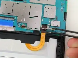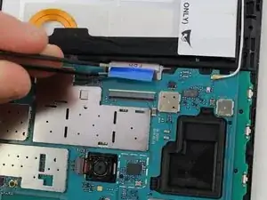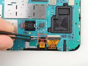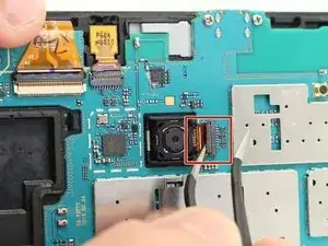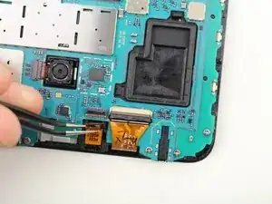 Используйте пинцет, чтобы приподнять защёлку, соединяющую фронтальную камеру с материнской платой.
