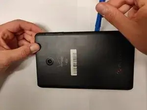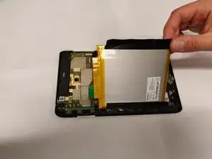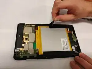 После того, как вы снимете заднюю часть Verizon Ellipsis 8, аккуратно используйте лопатку, чтобы приподнять одну сторону скотча. Как только вы приподнимете скотч, аккуратно снимите его, пока он полностью не отойдет от аккумулятора.