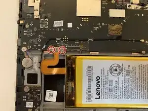 С помощью отвёртки Phillips #00 выкрутите два винта, крепящих пластину разъёма аккумулятора.