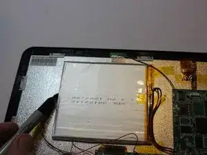 Аккуратно подденьте монтажной лопаткой клеевые подкладки между аккумуляторным блоком и задней защитной панелью экрана.