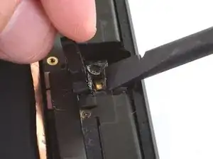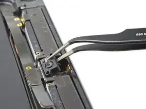 Используйте пинцет, чтобы захватить переднюю камеру и повернуть её по часовой стрелке, чтобы протянуть шлейф через его слот в рамке.