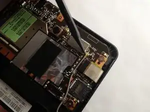 Подденьте шлейф антенны GPS строго вверх, используя лопатку или другой подходящий инструмент. Это серый провод, идущий по правой стороне устройства от динамического излучателя к материнской плате.