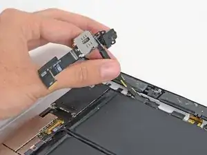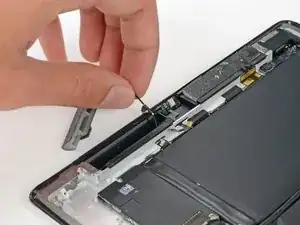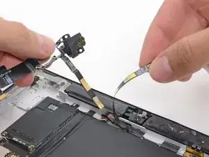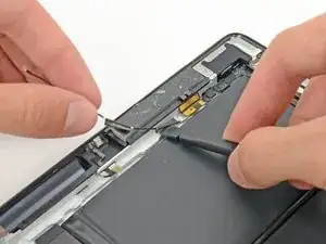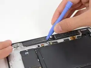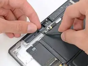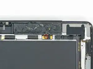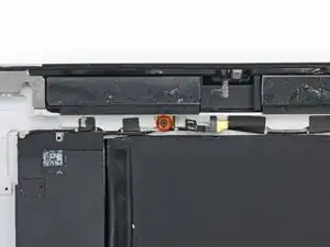 Антенна прикреплена к нижней части iPad с помощью винтов и кабеля. Этот шаг отсоединяет антенну от передней панели, гарантируя, что когда вы удалите панель, антенна не будет повреждена.