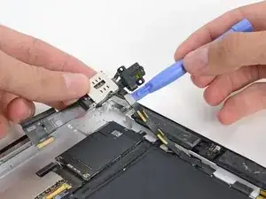 Используйте пластиковый инструмент для открытия, чтобы помочь вытащить разъем для наушников из его углубления в верхней части задней панели.