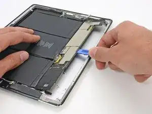 Протяните конец открывающей лопатки вдоль нижнего края iPad, освобождая клей над антенной Wi-Fi.