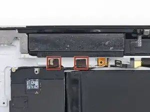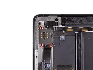 Удалите два винта Philips 2.1 мм, которые удерживают кронштейн логической платы на заднем корпусе рядом с гнездом кабеля цифризатора.