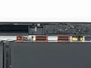 На этом шаге вы удалите три кусочка ленты, фиксирующие антенну правой ячейки на задней панели.