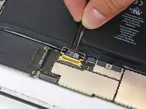 Используйте пластиковый инструмент для открытия, чтобы поднять фиксатор, удерживающий шлейф верхней компонентной платы в гнезде на логической плате.