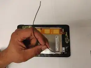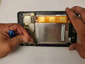 После снятия задней крышки Verizon Ellipsis 8 аккуратно воспользуйтесь лопаткой, чтобы приподнять один край ленты. После того, как лента будет поднята, медленно снимите её полностью с аккумулятора.