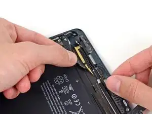 Потяните широкую ленту к верхней части iPad, прикладывая постоянное усилие, чтобы освободить её от антенного кабеля между лентой и динамиком.
