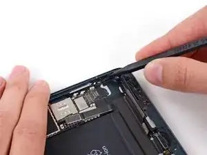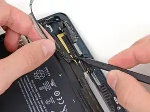 Кончиком лопатки снимите маленький кусочек ленты, фиксирующий антенный кабель в правом нижнем углу iPad.