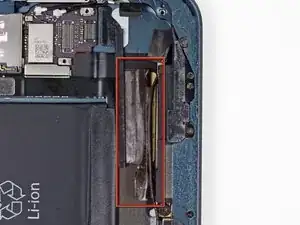 Плоским концом лопатки ослабьте пенопластовый клей, фиксирующий Wi‑Fi/Bluetooth антенну к левому динамику.