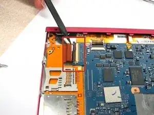 Используя плоский конец лопатки, отогните четыре защелки, которые фиксируют узкие оранжевые ленты, соединяющие материнскую плату с экраном, аудио/разъемом адаптера переменного тока/разъемом micro-USB и портами карт памяти/PRODuo.