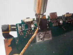 Выберите точку соединения и поместите паяльник на оплётку над существующим шариком припоя.