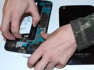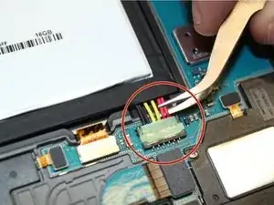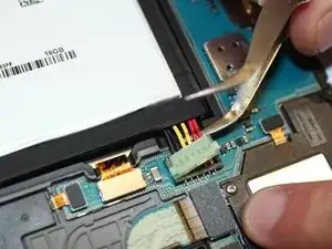 Чтобы отсоединить батарею, используйте небольшой инструмент, например пинцет, чтобы отключить разъём батареи от платы.
