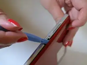 Снимите заднюю крышку, приподняв её с помощью пластикового инструмента, под слотом кнопки камеры.