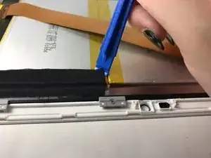 Вставьте пластиковый инструмент для вскрытия между передней панелью и задней крышкой в верхнем левом углу планшета.