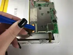 Используя пластиковый инструмент для вскрытия, поднимите чёрный фиксирующий язычок, который удерживает ленточный разъём ZIF (нулевое усилие вставки) батареи на плате.