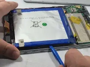 Используйте пластиковый инструмент, чтобы осторожно, но уверенно поддеть батарею по краям, пока она не освободится.