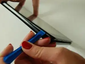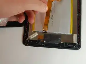 После того как все провода будут удалены с материнской платы, возьмите пластиковую лопатку и отделите батарею от задней стороны экрана. Она приклеена, так что не волнуйтесь.